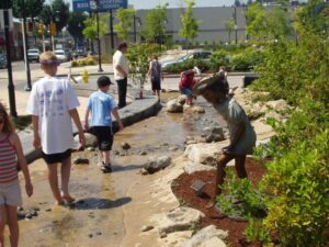 Together, these two lovely water features have visually anchored the Piazza since the early 2000s. And the splashing water features incorporate generous bench seating which provide critical cool resting areas for scores of visitors on hot days.