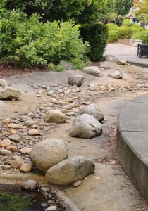 No more water. Renton’s lovely “Summer Breeze” girl has been stepping into a 40-foot long babbling stream bed for over 20 years, but the water has been removed and the girl will soon follow.