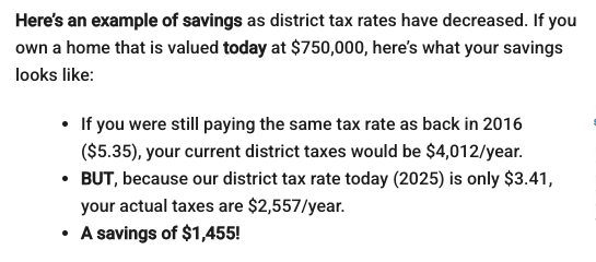 This screenshot from the District’s web page stresses the false claim that taxpayers are saving money, but taxpayers are actually paying more than ever due to higher property valuations.