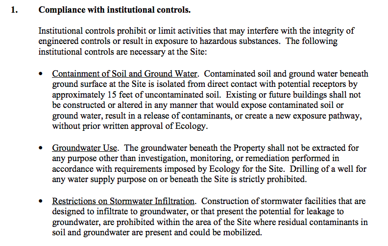 According to the Department of Ecology, there is still formaldehyde, petroleum residue and potentially other industrial waste on the site that is acceptably capped and monitored so long as none of the soil, concrete, and buildings are disturbed. Any digging on the site requires Department of Ecology approval and likely a new environmental remediation plan. The site is also subject to continuous monitoring for chemical movement, and carries liability for whoever owns it.