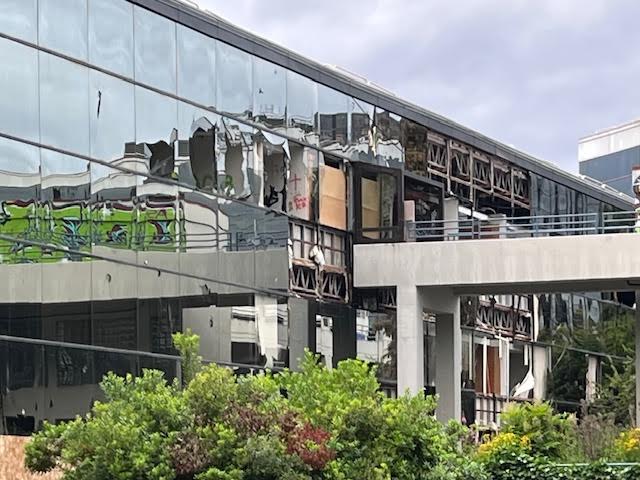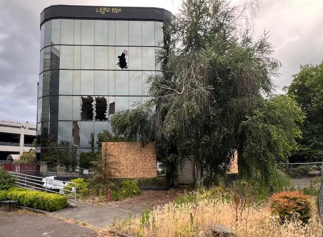 Structural demolition has not started yet, but it looks like it has. This view of the back of the 500 Park Avenue building (former Boeing 10-13) shows the vandalism that has occured since 2021.