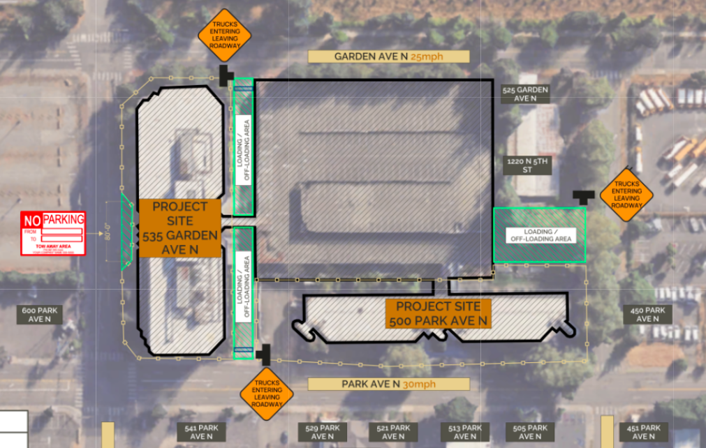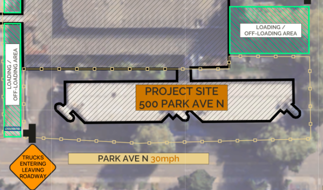 The 500 Park building is set back by a landscape buffer from the street. This will make demolition access easy without needing street closures. This demolition plan is available here.